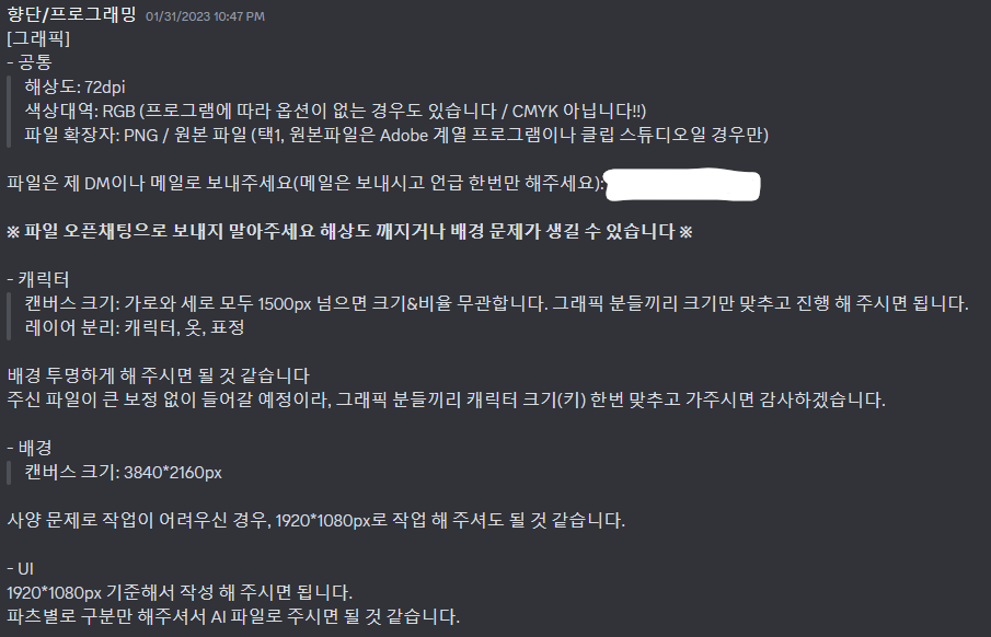 그래픽 마감 일정은 내가 결정했다. 일단은 프로그래밍 파트는 내가 주도하기로 했고, 기획팀에서도 '프로그래밍 일정에 맞추는 게 낫지 않겠냐' 하셔서 같이 작업하는 분과 합의해서 전달드렸다.