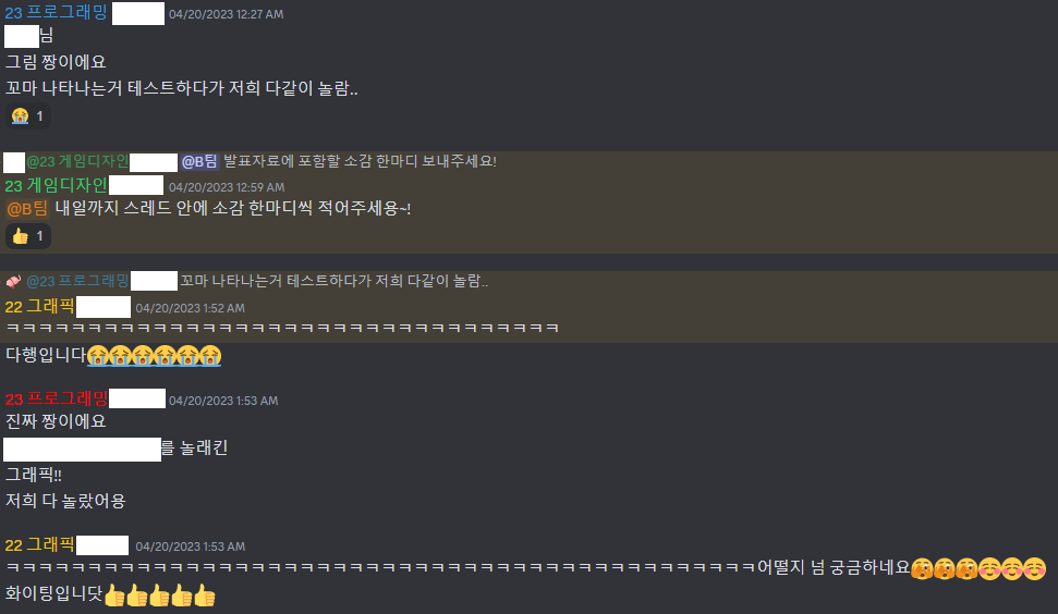 팀 배정을 받자마자 놀랐다. 본인을 제외한 7명의 팀원 중에서 4명(기획 2, 프로그래밍 1, 그래픽 1)이 아는 사람이었다.