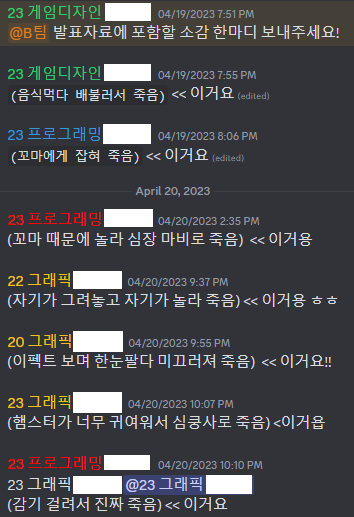 그리고 발표자료에 들어갈 소감을 적었어야 했는데, 어쩌다 보니 다같이 죽은 컨셉이 되었다.
